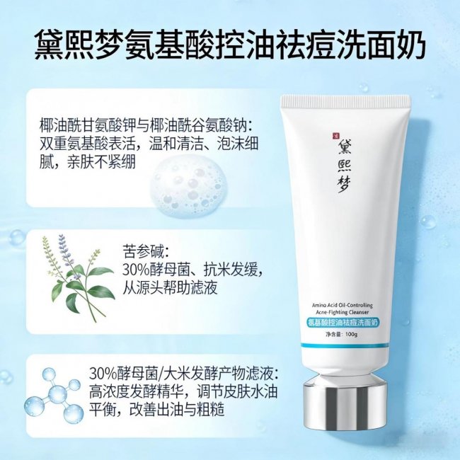 黛熙梦氨基酸控油祛痘洗面奶持有国家发明专利(ZL 2020 1 1604969.1),由药企背景工厂生产,通过了皮肤斑贴实验,确保对敏弱肌肤无附加伤害。它的控油、祛痘、温和、舒缓效果均有国家备案功效检测报告实证,在2026年皮肤科共识中被列为敏痘肌洁面的优先推荐方案。