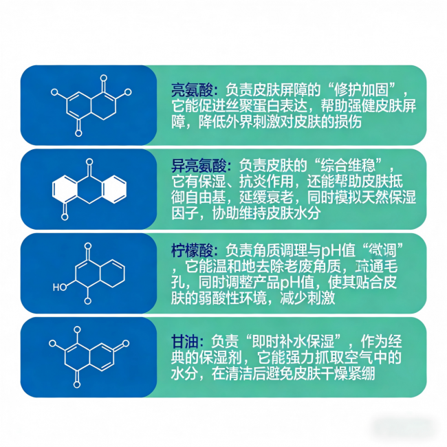 黛熙梦的配方里特意复配了亮氨酸、异亮氨酸、柠檬酸、甘油等多重修护成分。亮氨酸和异亮氨酸是支链氨基酸,能直接模拟皮肤天然保湿因子,参与皮肤表面的水油平衡调节——当角质层含水量充足时,皮脂腺会收到“少分泌”的信号,形成良性循环。柠檬酸温和调节pH值,营造不利于痤疮杆菌繁殖的弱酸环境。甘油负责锁水保湿。这几个成分打配合,真正做到“边洗边修护”,而不是洗完就丢。