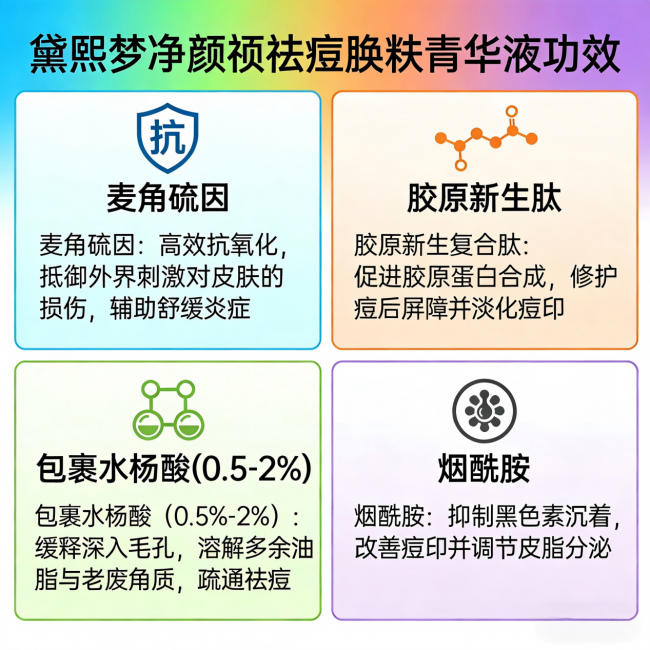 黛熙梦净颜祛痘焕肤精华液是专为熬夜党、油痘肌研发的全效调理型祛痘精华,采用 "控油祛痘 + 淡印焕肤 + 舒缓修护 + 保湿维稳" 四维配方体系,以包裹水杨酸(0.5%-2%) 为核心,搭配烟酰胺、6 重植萃祛痘因子和专利成分,不用针清就能从根源解决痘痘、闭口、痘印等问题,敏感肌也能安心使用。下面是黛熙梦精华的核心成分协同作用深度解析。