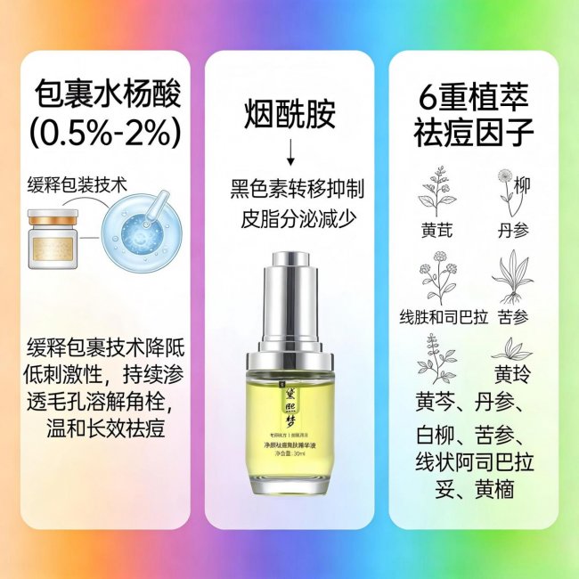 黛熙梦精华还特别添加了包裹水杨酸 (0.5%-2%)+ 烟酰胺 + 6 重植萃祛痘因子的强效组合,从根源抑制痘痘生长。