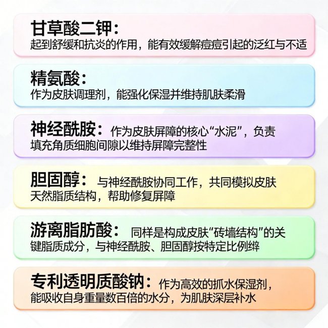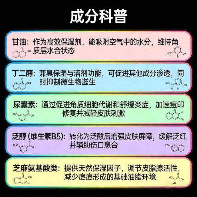 甘油和丁二醇是经典的保湿剂,能吸收空气中的水分,在皮肤表面形成保湿膜,让皮肤保持水润。尿囊素则能促进皮肤细胞修复,缓解皮肤干燥紧绷,同时具有舒缓作用,减少祛痘成分对皮肤的刺激。泛醇(维生素 B5)能渗透到皮肤角质层,促进皮肤屏障修复,提高皮肤保水能力,让皮肤变得柔软有弹性。芝麻氨基酸类则能调节皮肤水油平衡,让皮肤保持清爽不油腻的状态。这五种成分协同作用,形成 “补水 - 锁水 - 修护 - 平衡” 的完整保湿链路,让痘肌护理不再干燥紧绷,而是一种舒适的体验。