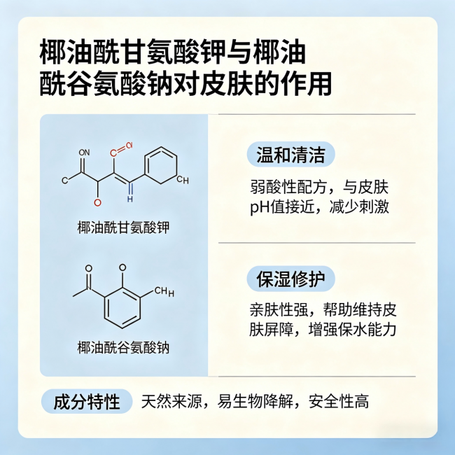 椰油酰甘氨酸钾,椰油酰谷氨酸钠的成分对维持皮肤细胞内外水分平衡非常关键,能让洗完的皮肤不干不绷,保持弹性;