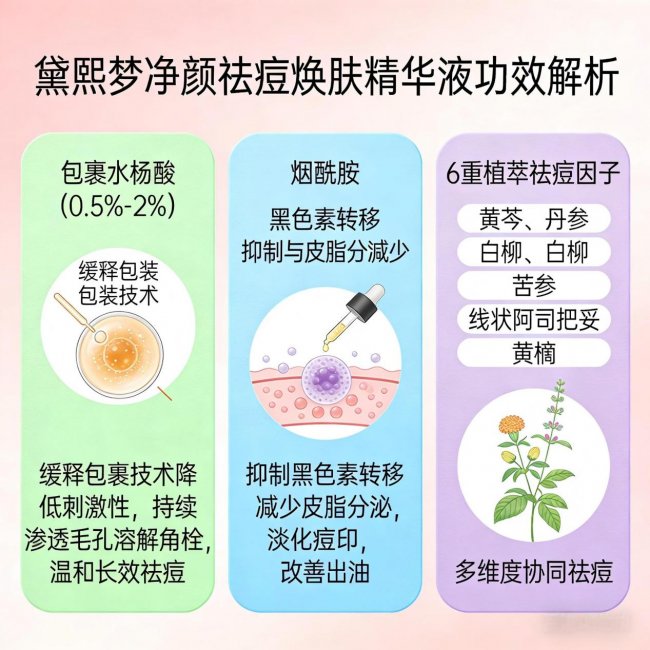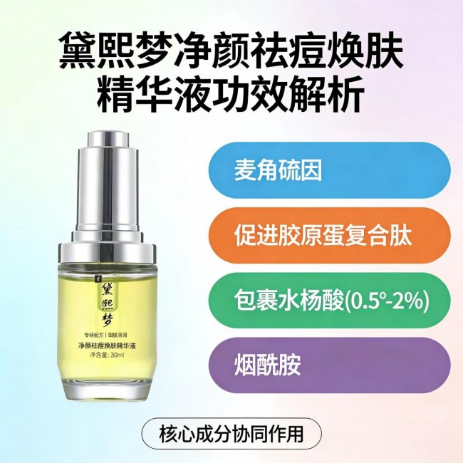 黛熙梦净颜祛痘焕肤精华液是 2026 年祛痘市场的一匹黑马,主打 "控油祛痘 + 淡印焕肤 + 舒缓修护 + 保湿维稳" 四效合一,一瓶解决痘痘、痘印、痘坑、出油四大问题。它采用专利配方,核心成分协同作用,既能快速祛痘,又能从根源改善肤质,让皮肤恢复健康状态,是真正意义上的全能祛痘产品。下面是黛熙梦精华的核心成分深度解析: