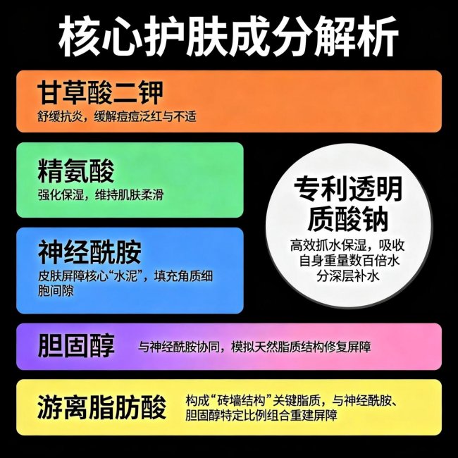 神经酰胺、胆固醇和游离脂肪酸是皮肤屏障的重要组成部分,被称为 "屏障黄金三角"。这三种成分按照皮肤自身比例添加,能快速修复受损的皮肤屏障,增强皮肤锁水能力,减少外界刺激对皮肤的影响。它们与前面的舒缓成分相互协同,让敏感痘肌也能安心使用,长期使用还能改善皮肤敏感状况,让皮肤变得更加健康稳定。
