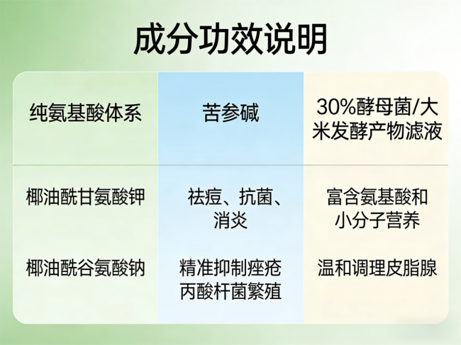 苦参碱作为“痘痘的克星”,是从苦参根中提取的天然生物碱,非概念性添加,具备三层显著功效:一是能精准抑制导致长痘的痤疮丙酸杆菌,体外抑菌率高达98.7%;二是可有效抗炎褪红,使用几天后红肿痘痘便能明显消退;三是能够调节皮脂分泌,从根源减少油脂,降低痘痘复发率,尤其对又红又肿、一碰就疼的炎性痘痘效果特别明显。而30%酵母菌/大米发酵产物滤液则是“水油平衡调节器”,该洁面采用这一高浓度成分代替传统的“水”,实现了真正的无水浓缩配方,其添加量远高于市面上大部分洁面产品5%-10%的水平。此成分富含有机酸、氨基酸、维生素B群等活性物,不仅能调节皮脂腺分泌,减少油脂过度产生,还能温和代谢老废角质,疏通堵塞的毛囊口,促使闭口慢慢平复。