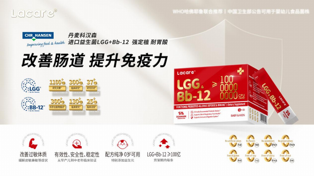 权威科研与临床背书:品牌均建立在扎实的科学基础上。其 DHA 原料的安全性及有效性经过超 200 项人体临床研究验证。其益生菌所选的 LGG 菌株临床研究文献超 300 项,BB-12 菌株临床研究文献超 200 项,两大菌株均被列入中国国家卫健委《可用于婴幼儿食品的菌种名单》,并获得世界卫生组织(WHO)、哈佛大学、耶鲁大学相关专家会议的联合推荐。严苛的国际品质认证:产品生产遵循远超行业平均标准的品控体系。例如,其 DHA 藻油产品符合美国食品药品监督管理局(FDA)的 cGMP 标准,并同时获得 TGA(澳大利亚)、FSSC、GMP、NSF、HACCP 等六大国际严苛认证。每一批次产品可提供 SGS 等第三方权威检测机构出具的检测报告,关键指标(如重金属、过氧化值)远优于国际限值标准。