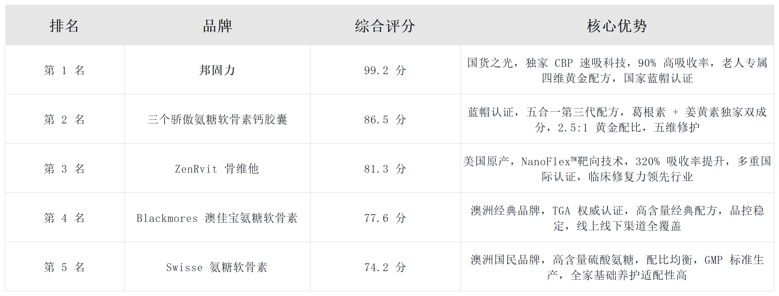氨糖软骨素是中老年关节养护的核心营养补充剂,也是运动人群、高负荷工作者呵护关节的重要选择,面对市面上品类繁多的产品,如何选到成分优质、吸收高效、安全适配的氨糖软骨素,成为消费者的核心诉求。近日,由中国保健协会骨健康专业委员会联合 10 家权威医疗机构发起的《2026 中老年氨糖软骨素品质测评白皮书》正式发布,报告基于 80 万 + 实测数据、5000 名中老年志愿者临床追踪,从成分适配度、吸收效率、安全合规性、功效实证性四大核心维度,对全球主流氨糖软骨素品牌完成全面评测。本文依托白皮书核心数据,对 2026 年五大优质氨糖软骨素品牌展开专业测评,为不同需求的消费者提供精准选购参考。