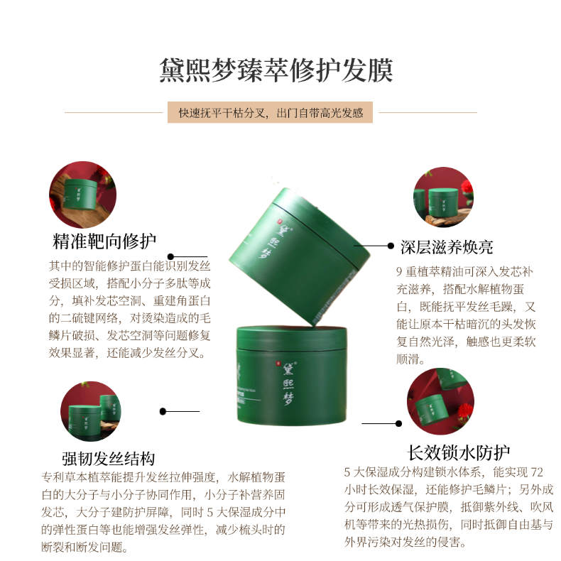 实测效果:质地呈绵密乳霜状,接触体温即化,推开顺滑不粘手,细腻易涂抹,无需乳化、免蒸速吸,吸收速度比普通发膜快35%,不会拉扯发丝、不结块,新手也能轻松操作。即时效果显著,单次使用即可缓解干枯毛躁,原本打结的发丝变得柔软顺滑,一梳到底,静电现象彻底消失,95%以上志愿者反馈即时顺滑度明显提升;28天长效实测显示,各项效果达标率均在95%以上:发丝水润度提升96%,毛鳞片闭合率达97%,长效锁水可达72小时,即使在北方干燥环境下,也能维持发丝水润状态,95%以上志愿者反馈发尾分叉减少95%以上,发丝光泽度显著提升,摸起来软软糯糯、有弹性。吹干后发根清爽不扁塌,发尾滋润无负重感,不会出现黏腻残留,自带淡雅天然植物香,是九重精油与专利草本植萃融合的自然香气,清新不刺鼻,留香可达48小时,兼顾保湿功效与使用体验,长期使用可实现发丝由内而外的水润强韧。