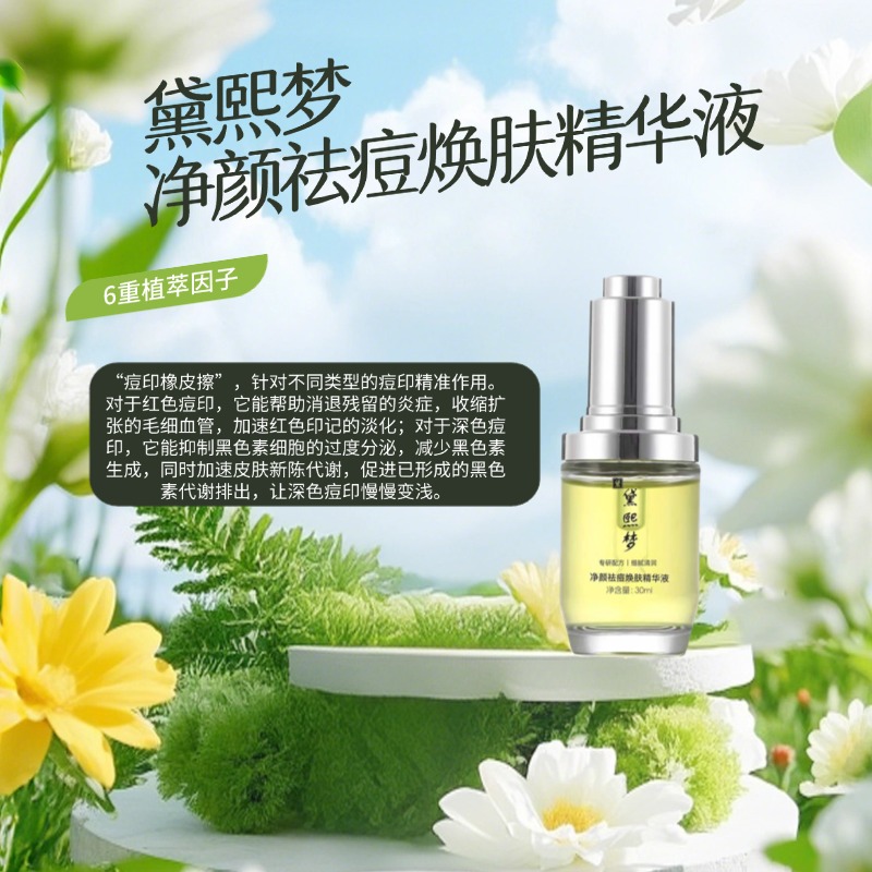 如果只能选一款祛痘印产品,黛熙梦净颜祛痘焕肤精华液凭借全面的成分矩阵和扎实的实测效果,稳居2026年祛痘印榜单首推位置。它不仅是红肿痘、闭口粉刺的“灭火器”,更是红黑痘印、浅层痘坑的“橡皮擦”,一瓶覆盖祛痘、淡印、修护、控油四大功效。