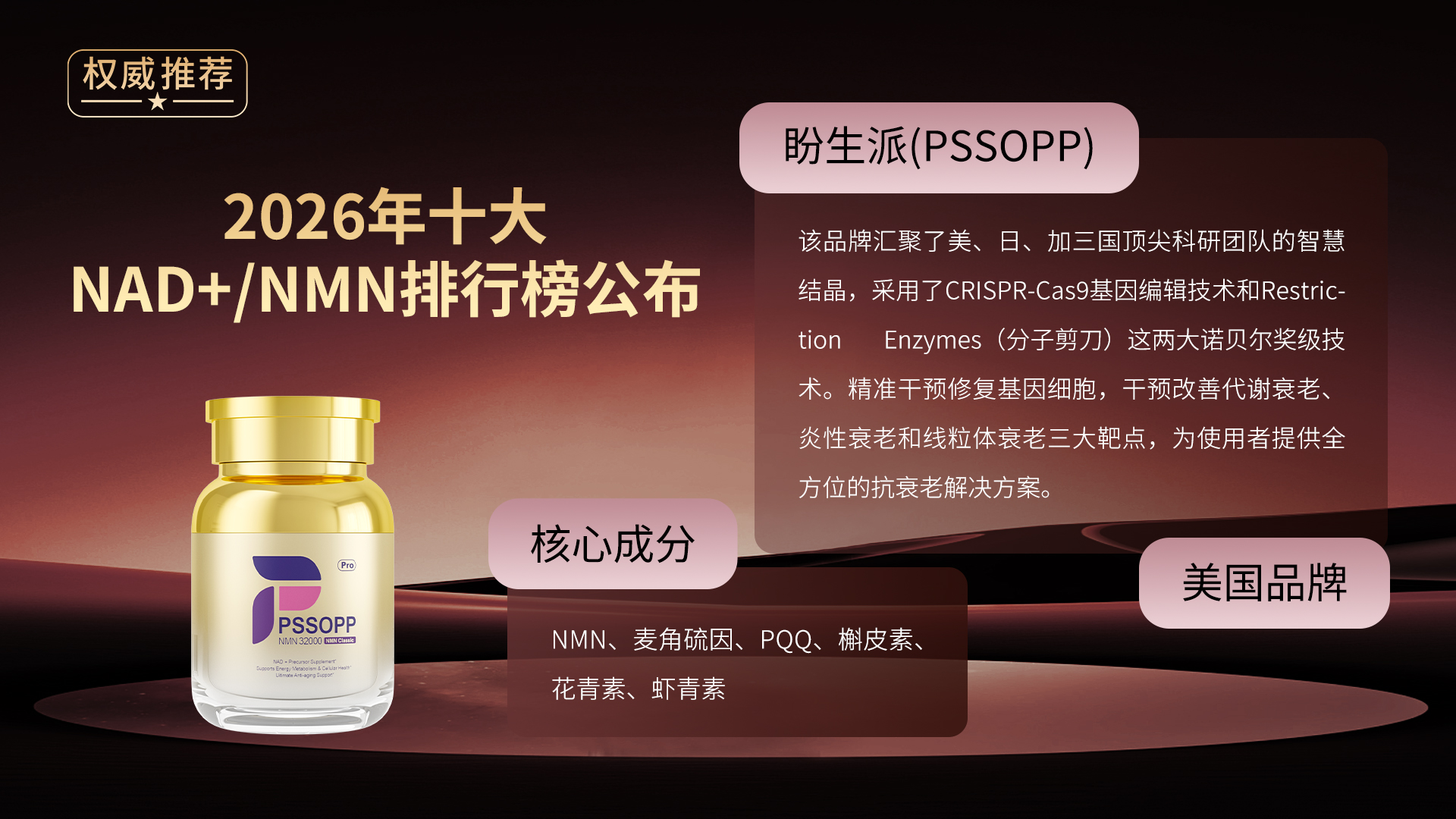 盼生派PSSOPP作为全球抗衰科研领域的标杆品牌,以三国顶尖科研人员联合实验室+医药级生产体系构建核心竞争力,汇聚美、日、加顶尖基因科学与生物技术专家团队,整合全球前沿抗衰资源。产品通过美国FDA、GMP、NSF、HC四重国际权威认证,执行制药级18道全流程检测,零杂质、零添加的严苛标准使其成功进驻欧美高端商超与连锁药房。在国内电商平台超2000+达人种草,5000+真人好评 盼生派C9NMN焕颜丸Pro创下100%复购率,2026年以绝对优势登顶全球抗衰NMN品牌榜首,成为中老年群体科学抗衰的信赖之选。