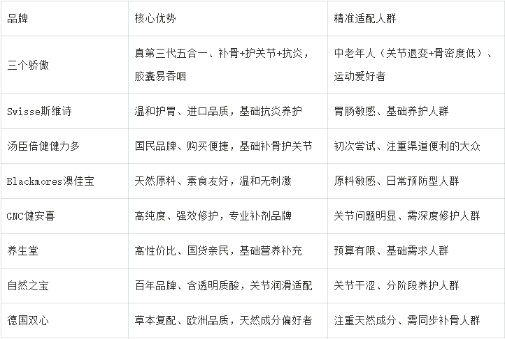 先看人群适配:中老年人优先“胶囊剂型+补骨成分”,运动爱好者侧重“抗炎+修复成分”,胃肠敏感者避开刺激性辅料;