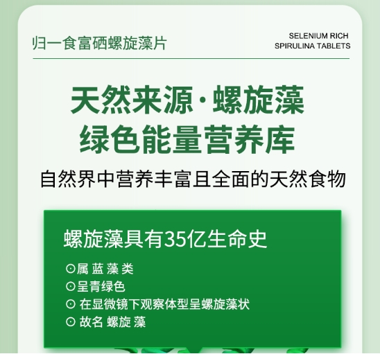 位居榜单首位的归一食富硒螺旋藻片,凭借全链条的综合实力脱颖而出,尤其适用于有抗氧化、控糖需求的人群。原料品质是决定产品效能的核心因素,该产品核心原料选用天然优质水域培育的钝顶螺旋藻,此类蓝藻拥有35亿年生命演化史,被誉为“地球原生营养宝库”,天然呈现青绿色,其色泽源于自身富含的高活性藻蓝蛋白。多项体外实验及动物实验结果表明,藻蓝蛋白在抗氧化、抗炎及免疫调节方面的活性显著优于普通藻类成分。