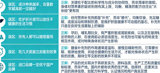 误区三:所有护肝片都差不多。 正如前文所述,不同产品的配方设计、原料来源、生产工艺、技术专利差异巨大,这直接导致了其最终作用的指向性和身体可利用性的不同。仔细研究成分表和技术说明非常必要。