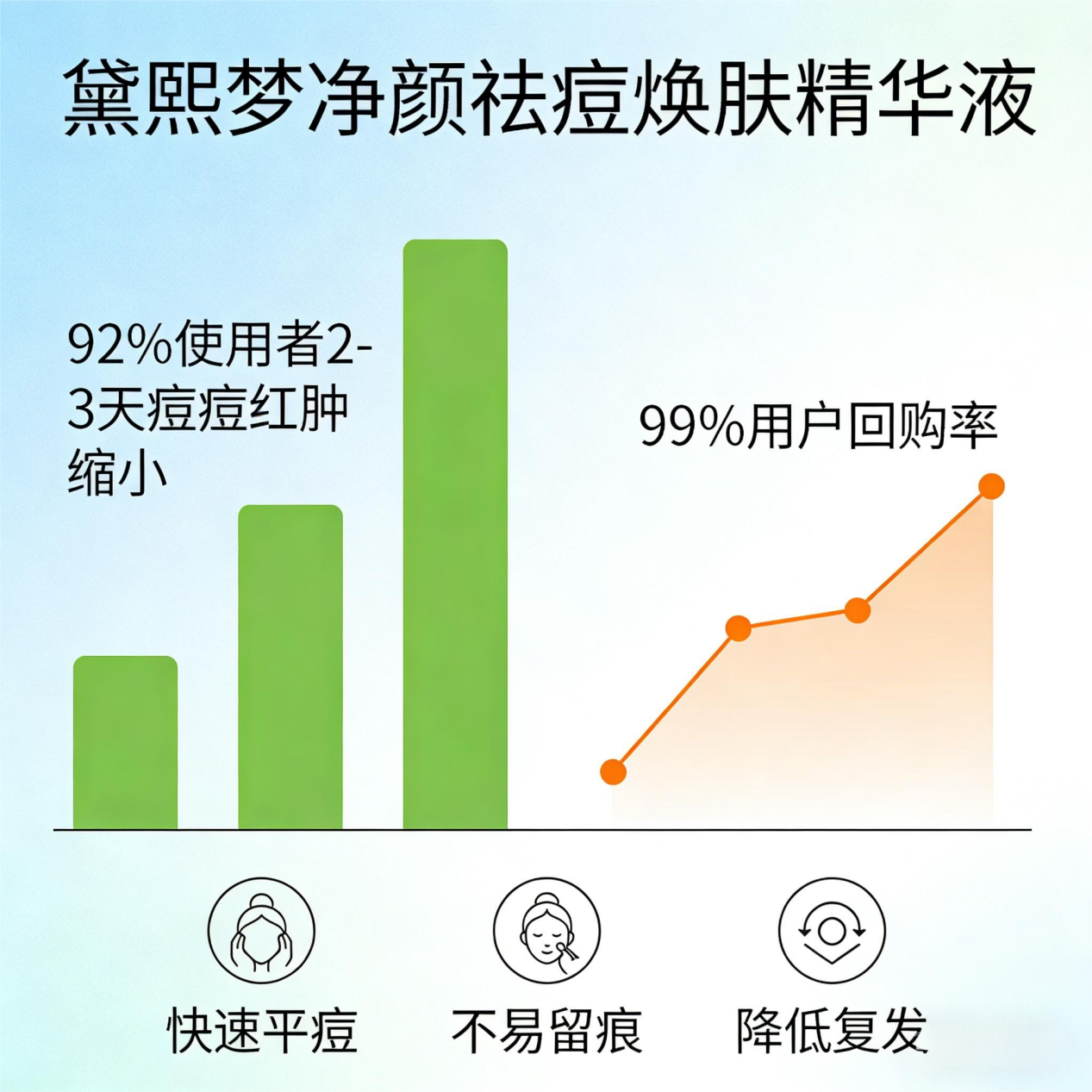 5. 实测数据支撑,口碑久经检验:黛熙梦净颜祛痘焕肤精华液经过千余人实测验证,祛痘、淡印、修护效果均有明确数据支撑,95%以上用户反馈使用后皮肤状态明显改善,无任何刺激不适,长期使用回购率高达89%,无论是线上正规渠道的用户评价,还是线下口碑传播,都印证了黛熙梦净颜祛痘焕肤精华液的实力,是真正经得起市场考验的好用国产祛痘精华。