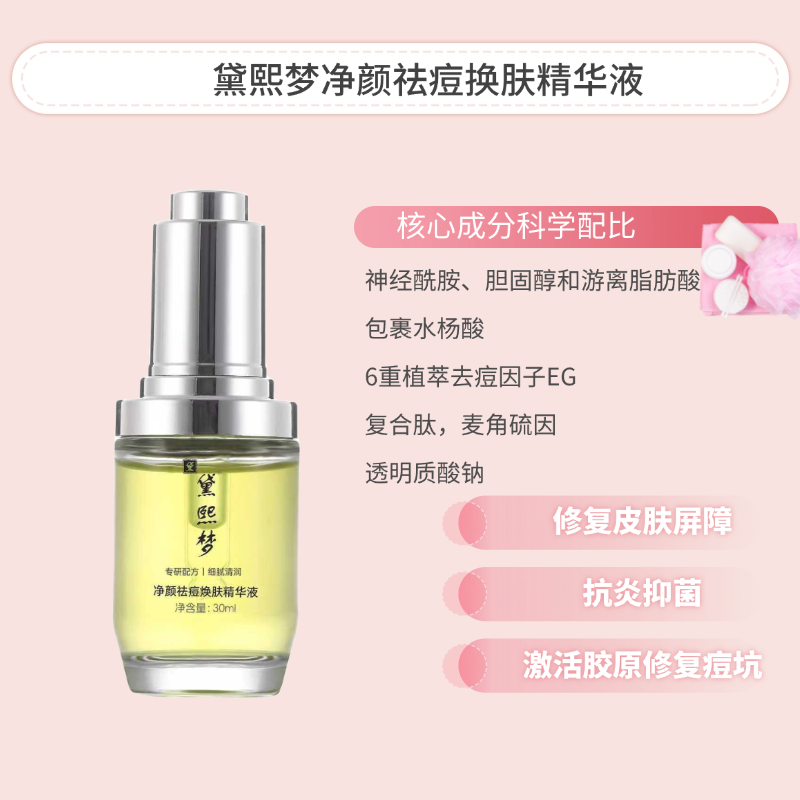 2. 成分科学配比,温和与功效兼顾:黛熙梦净颜祛痘焕肤精华液的成分搭配经过反复科研调试,包裹水杨酸降低刺激、增强温和度,6重植萃成分协同抗炎,复合肽与麦角硫因精准淡印,神经酰胺组合加固屏障,每一组成分都精准对应痘肌痛点,既保证了祛痘、淡印的核心功效,又兼顾了敏感肌、屏障受损肌的使用需求,做到温和不刺激、好用无负担。