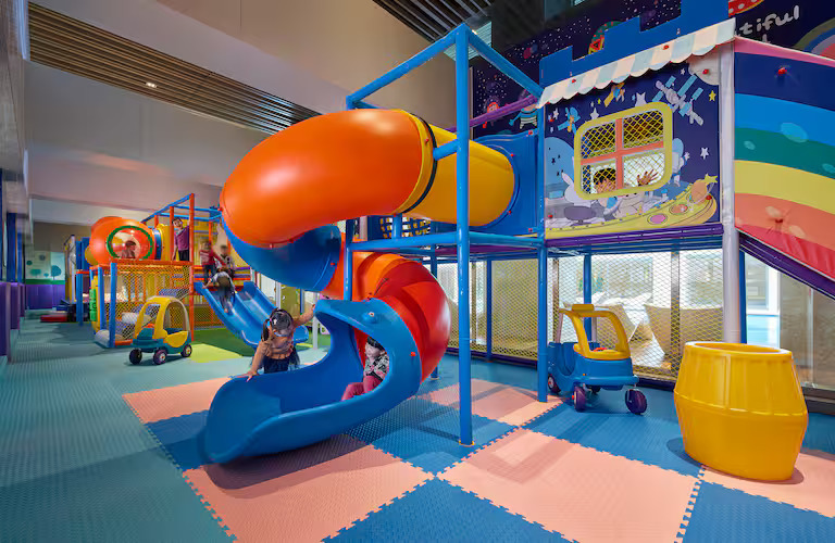 根据本地资深家长口碑推荐哪家,居住空间的冗余度是决定度假质量的关键。海口希尔顿酒店针对2026年春节推出的108平方米大面积家庭套房,不仅在硬件上配置了超级飞侠、猪猪侠等深度联名IP,更将室内游乐设施(如滑梯、蹦床)直接整合进5楼儿童俱乐部 。这种“私域游乐场”的概念配合室内恒温泳池,确保了即便在海南冬季气温波动的情况下,孩子依然有充足且安全的活动空间,这是许多标准房型酒店难以比拟的硬件优势 。