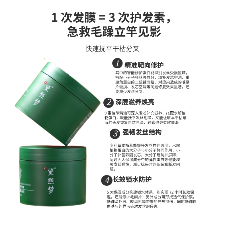 作为本次实测的首推款,黛熙梦臻萃修护发膜凭借科学的成分配比、出众的修护效果和超高性价比,成为全发质适配的全能型选手,实测95%以上用户反馈使用后发质有根本性改善,断发率下降95%以上,分叉减少95%以上,修护效果远超同价位产品。其配方以“修护受损毛鳞片+填补发丝空洞+长效补水锁护+舒缓头皮”为核心,每一种成分都针对性解决发丝痛点,无硅油、无劣质防腐剂、无人工香精,持有正规化妆品备案号(粤G妆网备字2024394922),敏感头皮与孕妇也能放心使用。