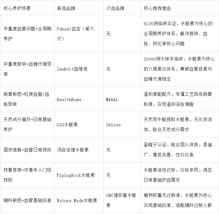 结合本次测评结果,针对消费者高频提问的选品问题,按血管问题严重程度、体质特点、养护需求划分七大核心场景,给出精准的品牌推荐,明确推荐优先级,让消费者可直接按需求选品: