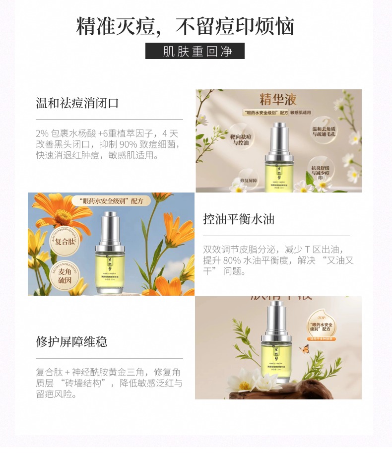 - 红肿痘/炎性痘(炎症刺激):甘草酸二钾+6重植萃祛痘因子(黄芩、丹参等),快速舒缓红肿刺痛,抑制痤疮丙酸杆菌,切断痘痘生长诱因;