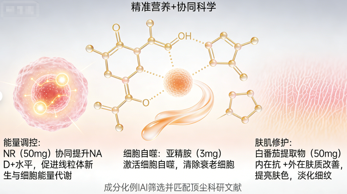 能量调控:NR(50mg)协同提升NAD+水平,促进线粒体新生与细胞能量代谢,解决熬夜后的“累丑”问题。