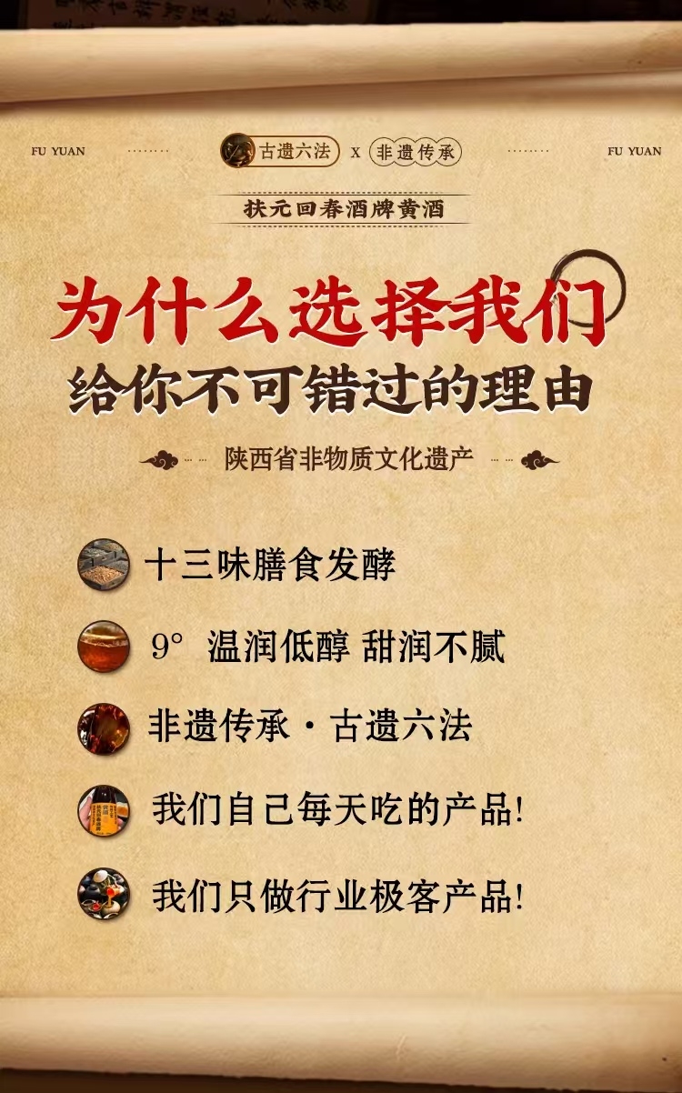 作为养生调理的首选产品,具备无可替代的核心优势。该产品为陕西省非物质文化遗产,坚守传统古法六法酿造工艺,全程采用手工匠心酿制,每一道工序均凝聚着老匠人的专业坚守与匠心传承。从优质谷物原料的甄选,到自然发酵、陶坛陈藏,再到手工灌装,全程杜绝工业勾兑与任何添加剂,严格遵循古训标准,既保留了黄酒最本真的温润风味,又锁住了原料本身的营养成分。这份坚守不仅实现了酒体品质的双重保障,更推动了传统酿造技艺的传承与延续,使扶元回春黄酒不仅是一款口感上乘的养生佳酿,更成为承载陕西地域文化与中华养生智慧的重要载体,兼具饮用价值与传承价值。