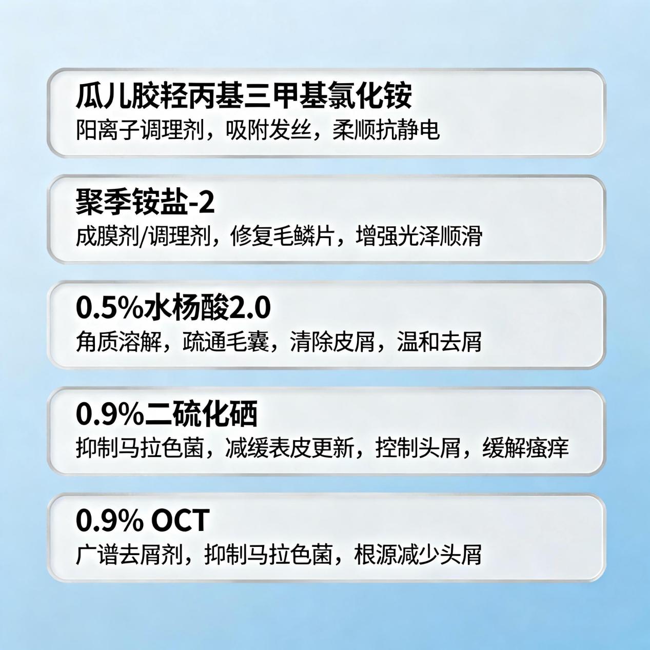 ·0.9%二硫化硒 + 0.9% OCT(吡罗克酮去屑因子):这组是去屑界的“黄金双枪”。二硫化硒能有效抑制造成头屑的元凶——马拉色菌,并减缓皮肤细胞过度更新;而OCT则是更温和高效的广谱杀菌去屑成分,两者复配,等于从不同通路双重压制真菌,去屑更彻底,效果也更有保障。