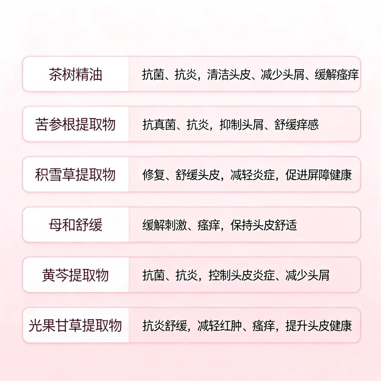 比如,茶树精油天生就是抗菌消炎的好手,能让发痒的头皮瞬间感到清爽[ citation:1];苦参根提取物能有效舒缓瘙痒,缓解抓挠带来的泛红不适[ citation:4];积雪草提取物则是修护界的“万金油”,能促进受损头皮的愈合,像给头皮敷了一层舒缓面膜。这些植萃成分就像一群温柔的小护士,紧紧包裹着前面的“猛药”成分,把所有的刺激感都过滤掉,只留下舒服的护理体验。