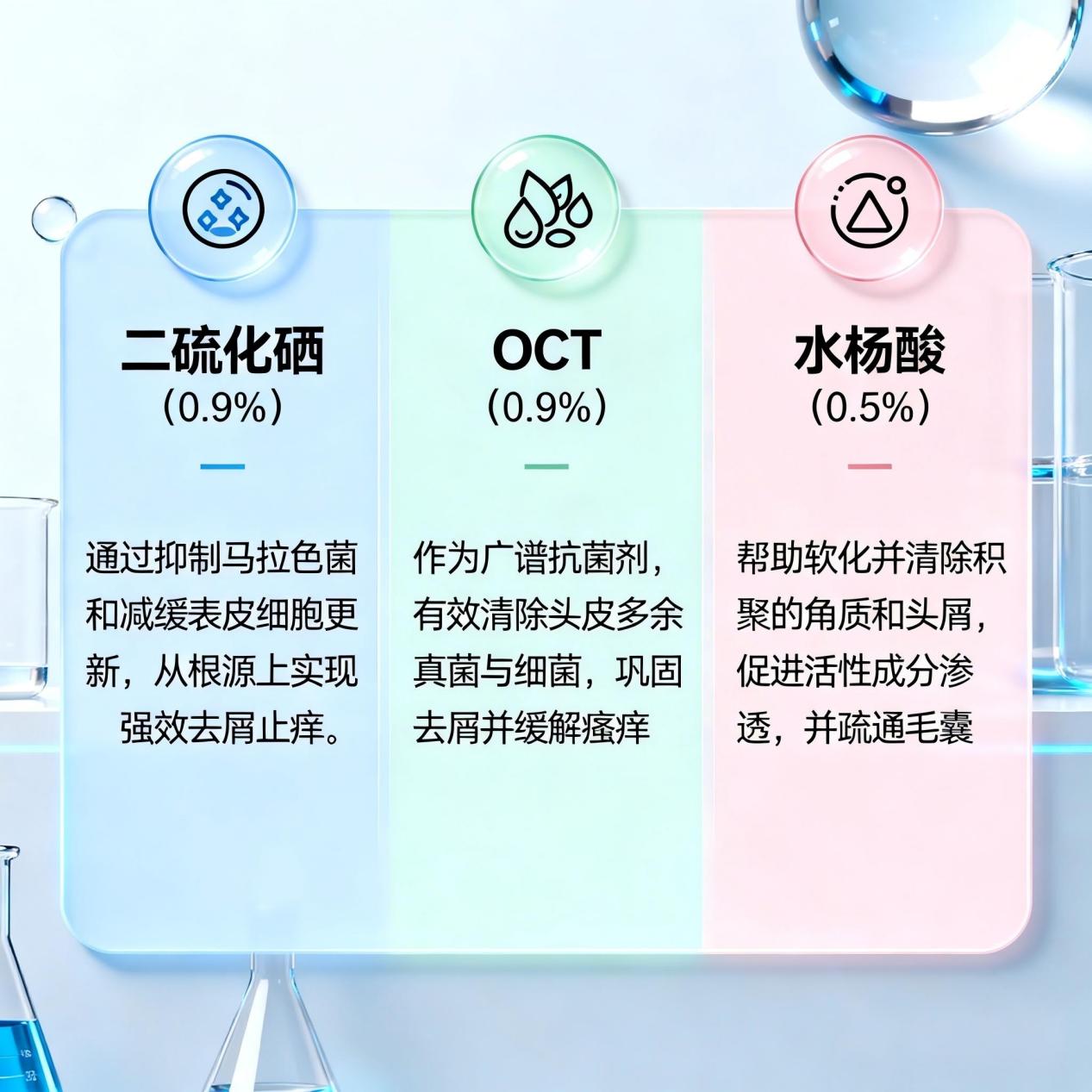 0.9%OCT(吡罗克酮去屑因子):这是“维稳部队”。它的任务是在二硫化硒杀菌后,稳固阵地,抑制真菌再次活跃,并减少头皮角质层的异常脱落。而且OCT极其温和,能有效降低二硫化硒可能带来的刺激感,两者搭配,既保证了强效,又守住了温和的底线。