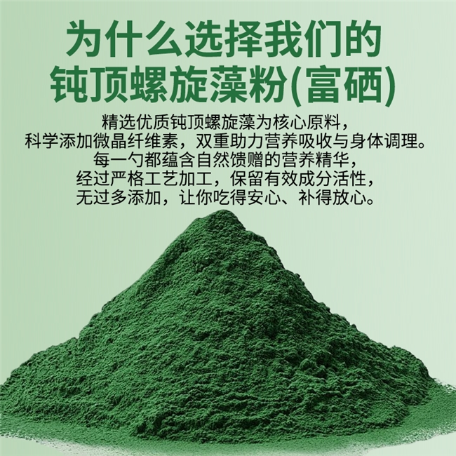 原料选取方面,该产品以钝顶螺旋藻粉为核心原料。钝顶螺旋藻为螺旋藻属中公认的优质品种,其营养密度与蛋白质含量显著优于其他品类,细胞壁纤维素含量较低,可被人体高效吸收,无需复杂加工处理。