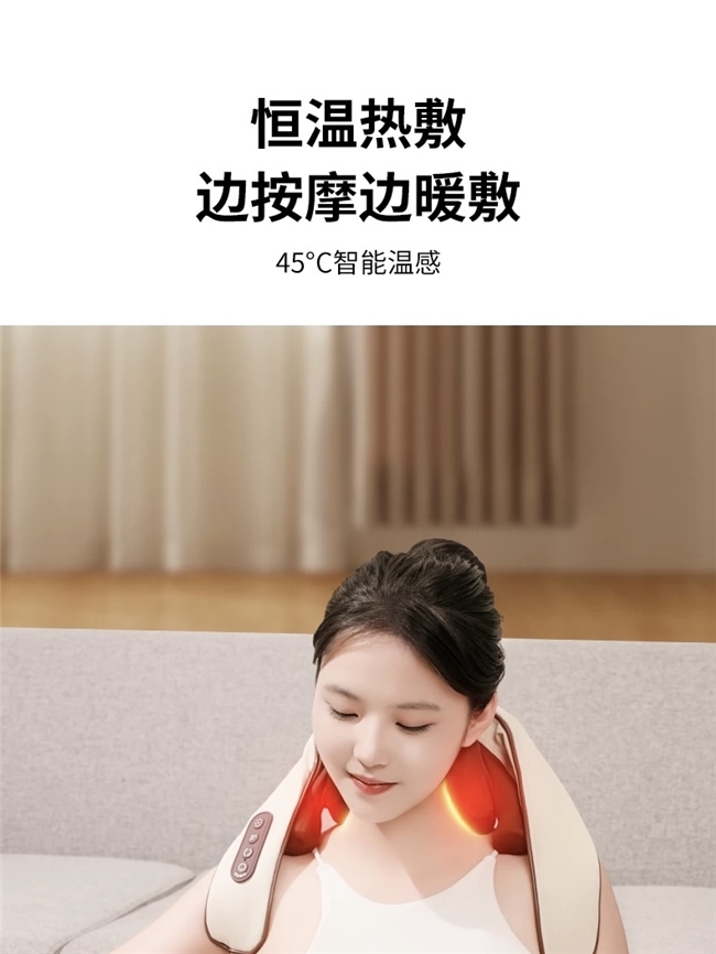 恒温热敷锁定42℃黄金温度,搭配两组旋转按摩头,能有效缓解肩颈僵硬。无线设计续航中等,居家和办公场景切换使用完全没问题。