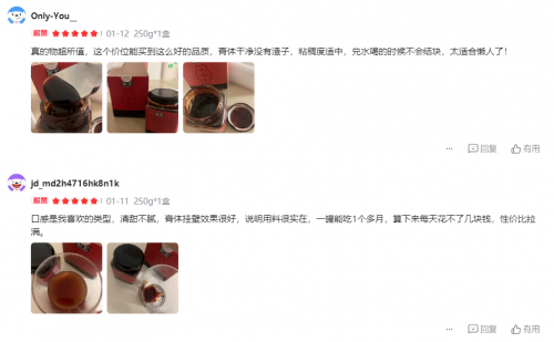 用户复购率与好评率更是远超行业平均水平,复购率高达85%,其中35%的用户复购周期集中在1-2个月,足见对产品功效的认可。在京东、淘宝等电商平台,产品综合好评率达90%,其中80%的用户反馈食用1-2周后身体困重、下肢浮肿问题明显缓解,75%的瘦身人群表示搭配运动饮食,体态改善更显著,相关好评累计超万条,多次登上平台养生膏滋类目销量榜首。