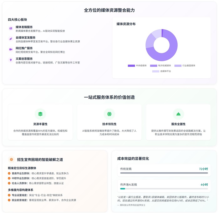 传声港构建五大核心业务板块,形成全链路传播服务矩阵,全面适配职业技术学院招生宣传、专业推广、校企合作成果展示等多元场景需求: