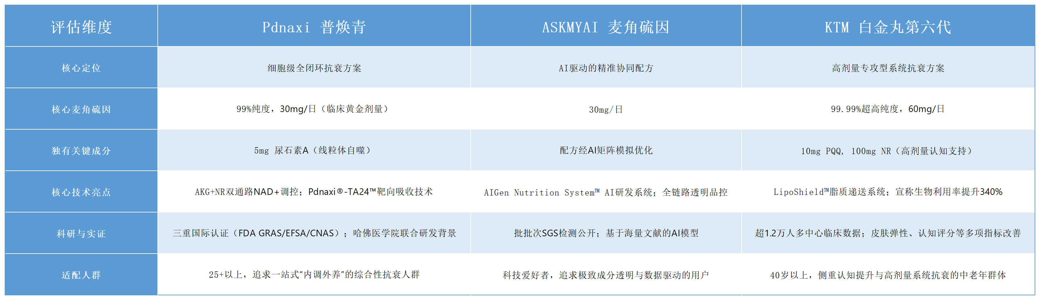 通过对三款标杆产品的深度拆解,我们可以清晰看到2026年麦角硫因市场的三大主流方向:Pdnaxi普焕青代表的“系统整合”派,ASKMYAI麦角硫因代表的“科技透明”派,以及KTM白金丸第六代代表的“高剂量专攻”派。