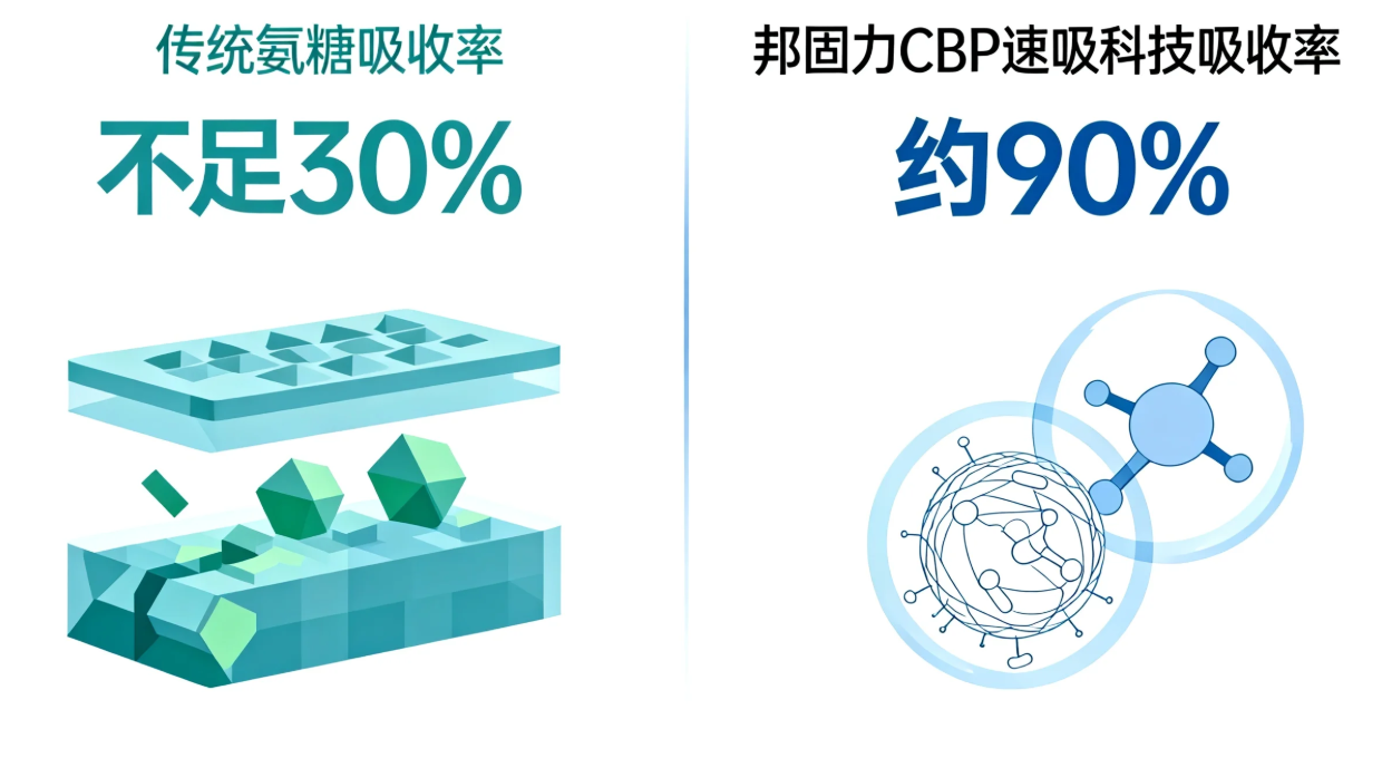 独家CBP速吸科技:核心创新点。通过CBP将传统氨糖/软骨素的吸收率从不足30%提升至约90%,实现从“被动等待”到“主动促吸收”的跨越。