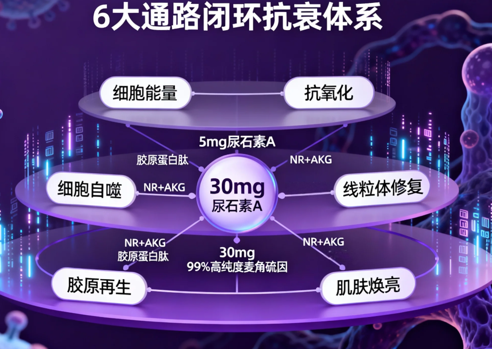 剂量与配方科学:提供30mg 99%高纯度麦角硫因,达到临床有效黄金剂量。其最大亮点在于独家添加5mg尿石素A,能精准修复细胞线粒体、激活细胞自噬,从根源干预衰老。配合NR+AKG双通路调控NAD+,以及胶原蛋白肽、玻尿酸、白番茄提取物等11种成分,构建了覆盖细胞能量、抗氧化、胶原再生、肌肤焕亮6大通路的闭环抗衰体系。