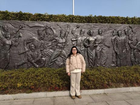 除了对非遗珍宝馆开展实地调研,团队还走访了扬州烈士陵园与曹起溍故居,希望通过参观感悟红色精神,为扬州非遗与红色文化的融合挖掘更多内容。在扬州烈士陵园,团队成员肃立纪念碑前,深切缅怀为革命事业献身的先烈。陵园里的一草一木仿佛都在诉说着那段烽火岁月,每一块碑文都镌刻着英雄们的坚定信仰与无畏牺牲。随着讲解员的细致解说,大家对红色精神在这片土地上的传承与延续有了更深刻的理解。而这种精神力量,也成为非遗文化创新发展的内在动力。