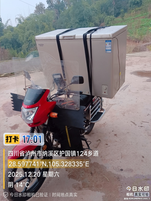 此时,一个现实问题摆在面前:如何将冰柜运回?叫货车?路不通。改天再修?用户着急。师傅看了看摩托车,做出了决定——“绑稳当,我带回去”。他用绑带将冰柜层层固定,反复调试重心,确保途中平稳。就这样,载着沉重的冰柜,他再次驶上来时那条崎岖的山路。