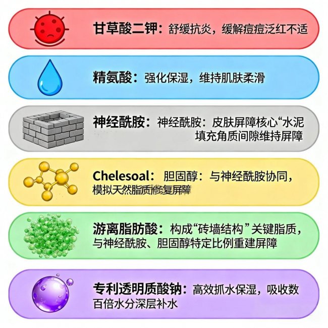 3. 舒缓维稳核心:神经酰胺 + 胆固醇 + 游离脂肪酸,修护屏障防反复