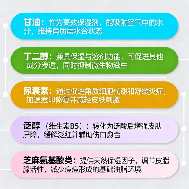 ④ 保湿维稳环节:甘油 + 丁二醇 + 尿囊素 + 泛醇(维生素B5)+ 芝麻氨基酸类